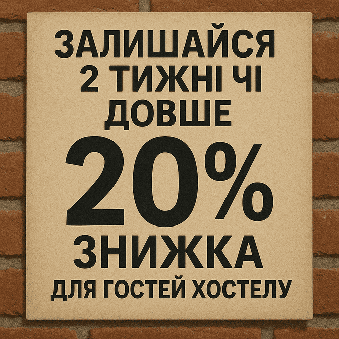 Якщо ви будете гостювати в нашому хостелі 2 тижні і більше, то для вас є знижка 10%.